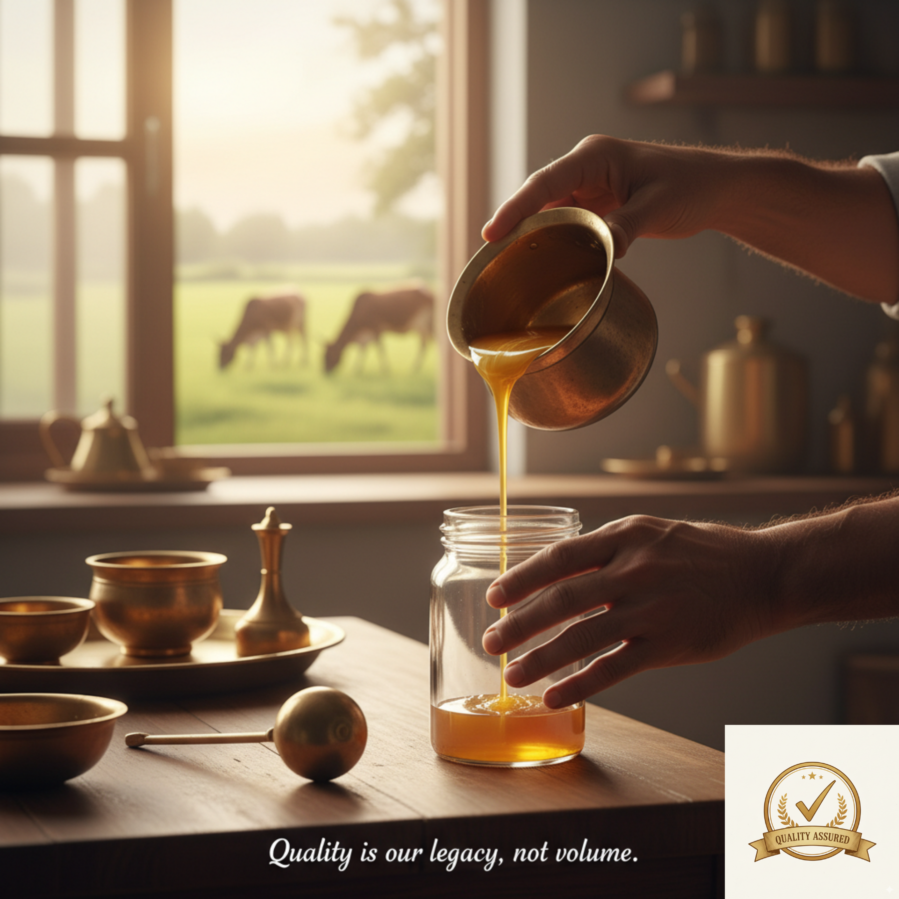 For example: To make 1 litre of authentic Bilona A2 Gir Cow Ghee, we need about 24 litres of milk. With Gir Cow milk at ~₹65 per litre, that’s already ₹1,560 in raw cost. Now add packaging, branding, labour, logistics, and compliance and you do the math. That’s why Ruvya ghee is truly premium, yet honestly priced.
