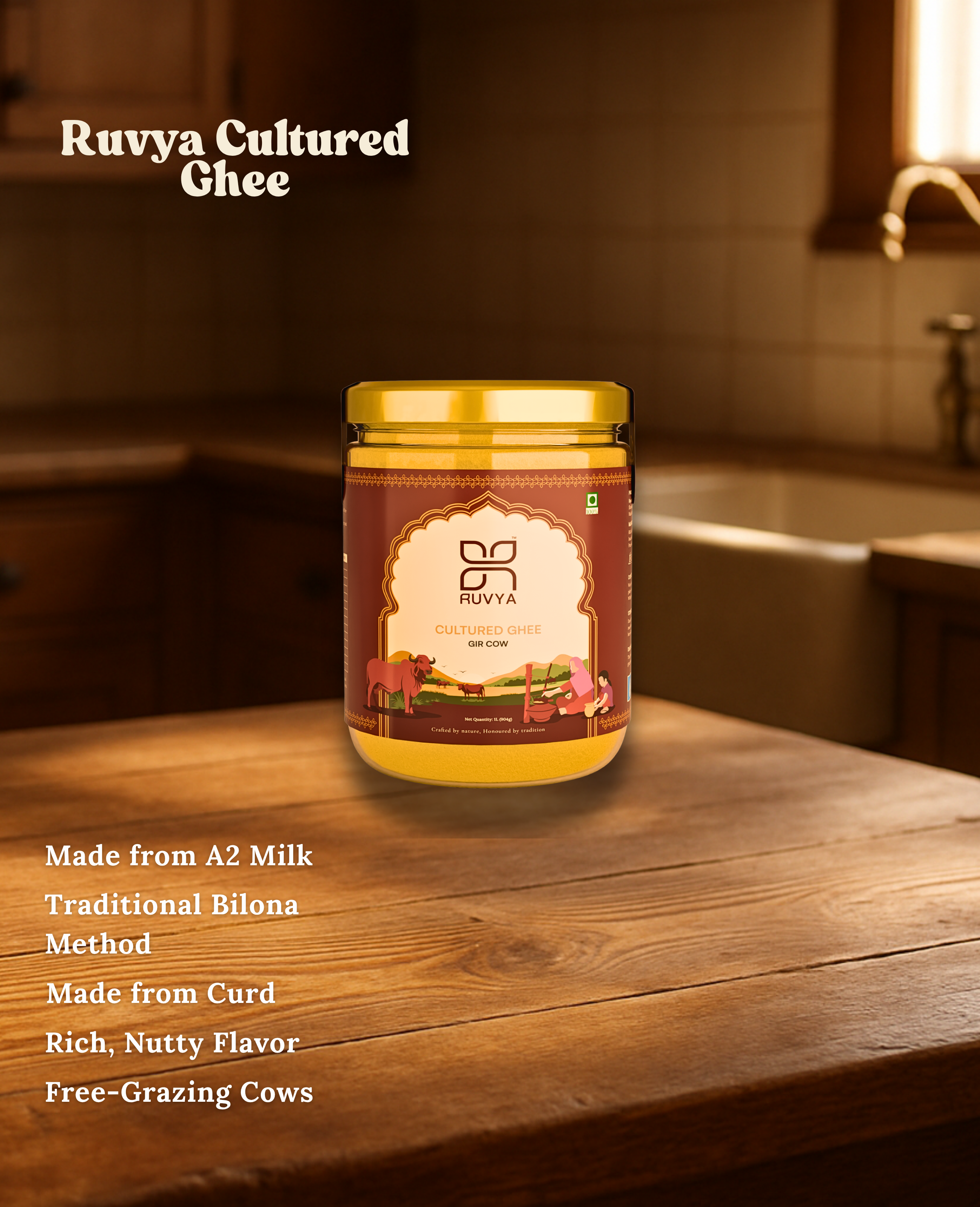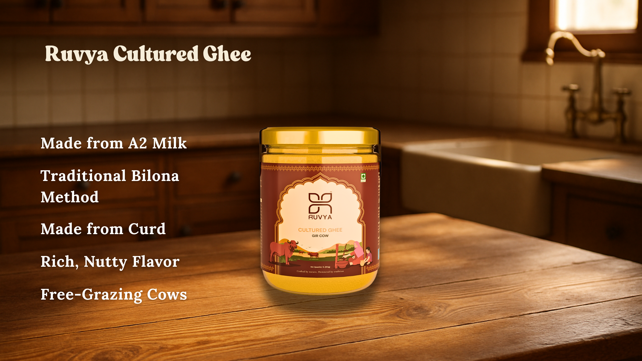 For example: To make 1 litre of authentic Bilona A2 Gir Cow Ghee, we need about 24 litres of milk. With Gir Cow milk at ~₹65 per litre, that’s already ₹1,560 in raw cost. Now add packaging, branding, labour, logistics, and compliance and you do the math. That’s why Ruvya ghee is truly premium, yet honestly priced.